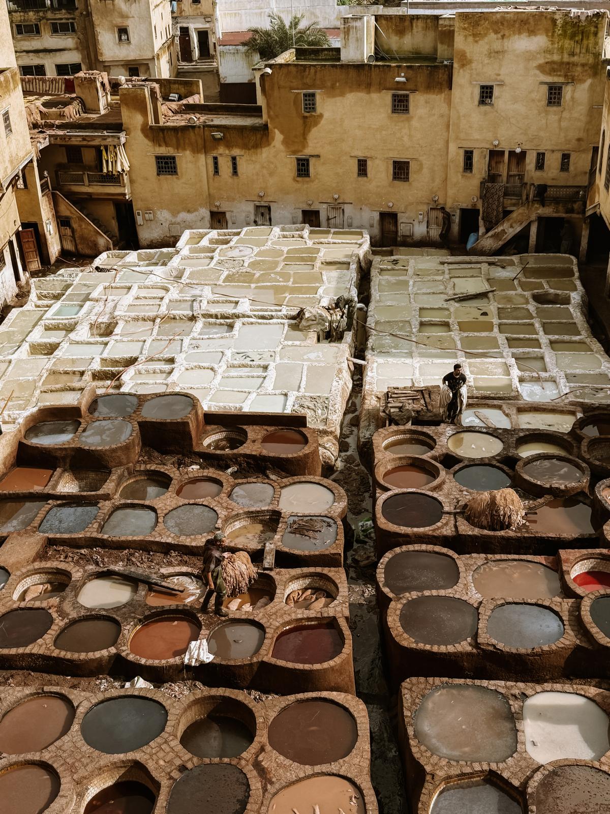 Die Gerberei selbst sieht man aus der Vogelperspektive. Du kennst sicher die berühmten Bilder mit den bunten Färbebecken. Genau diesen Blick bekommst du auch vor Ort. Was man vorher oft nicht weiß: Meist musst du durch ein Lederwarengeschäft laufen, um die Aussicht zu genießen.