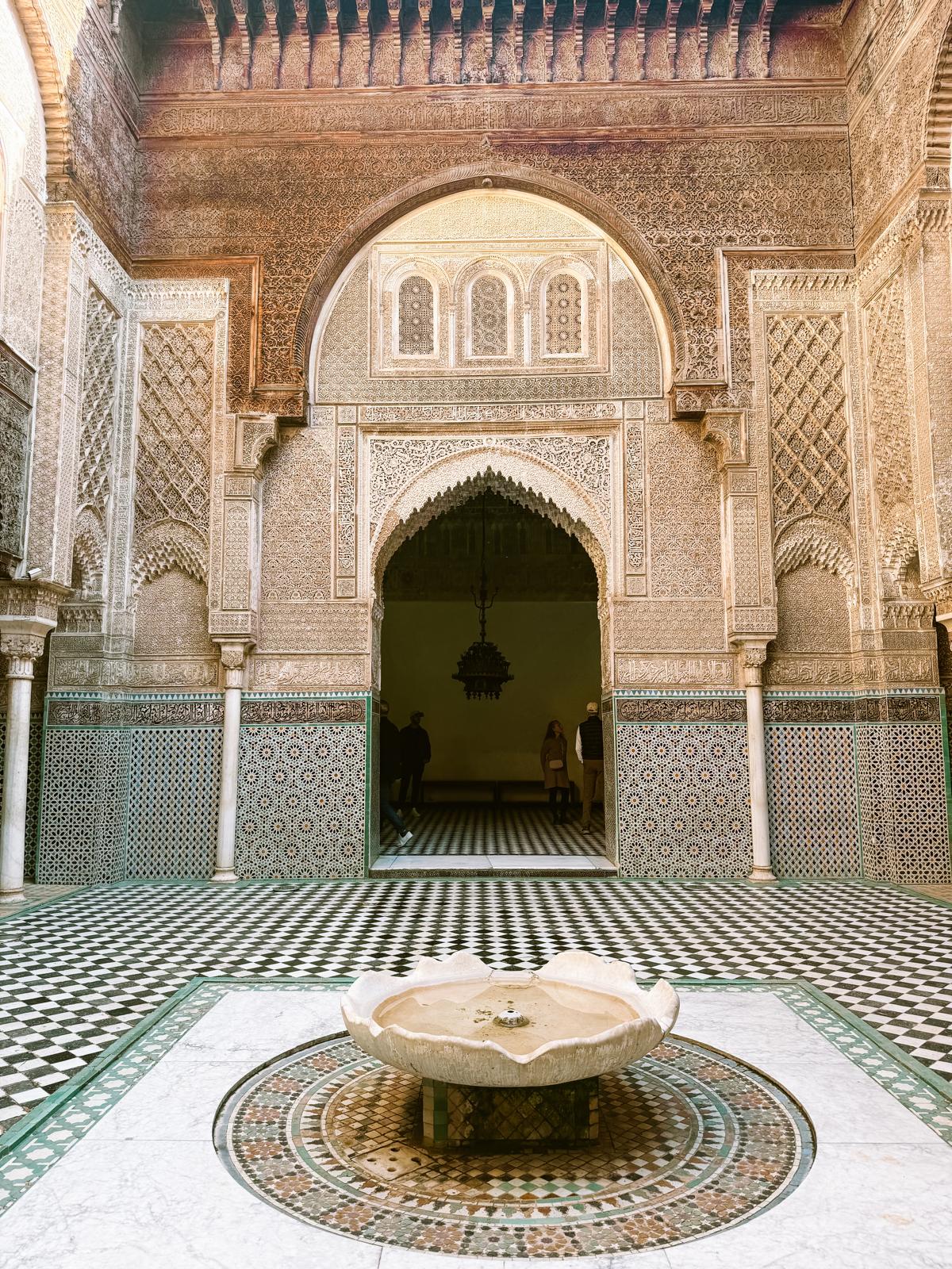 Die Bou Inania Madrasa ist die bekannteste Medersa in Fès und etwas größer als die Attarine. Auch sie stammt aus dem 14. Jahrhundert und beeindruckt mit aufwendigen Verzierungen, geschnitztem Holz und kunstvollen Fliesen.