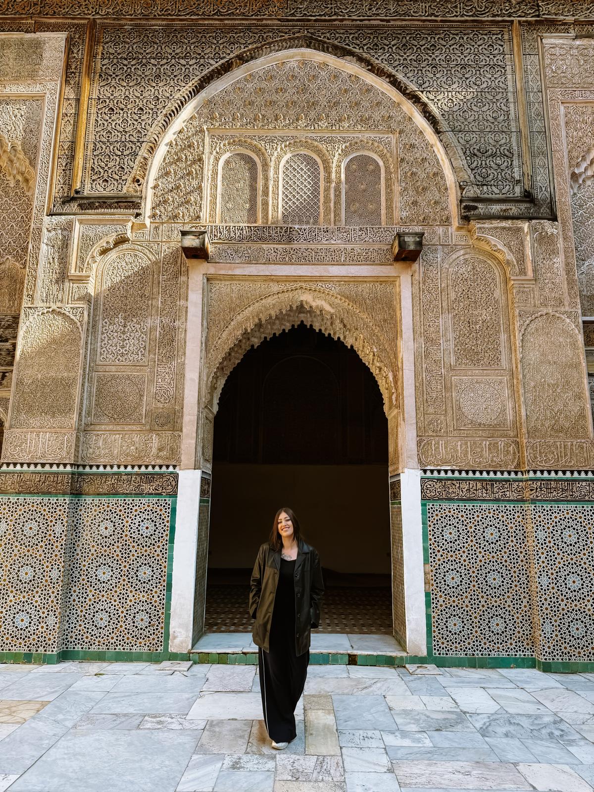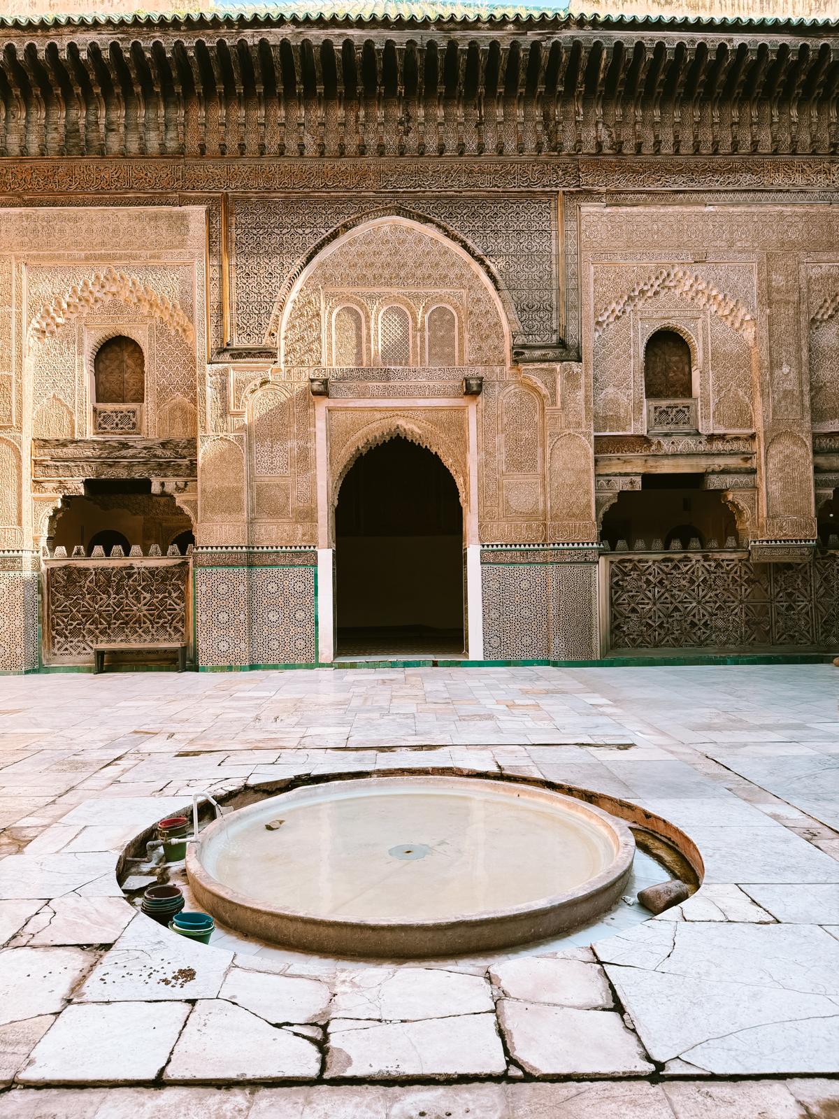 Der Eintritt liegt bei etwa 1,50€ und das Schöne: Du kannst die Medersa auch als Nicht-Muslim problemlos besichtigen. Innen erwartet dich ein ruhiger Innenhof, der einen starken Kontrast zum Trubel der Medina draußen bildet.