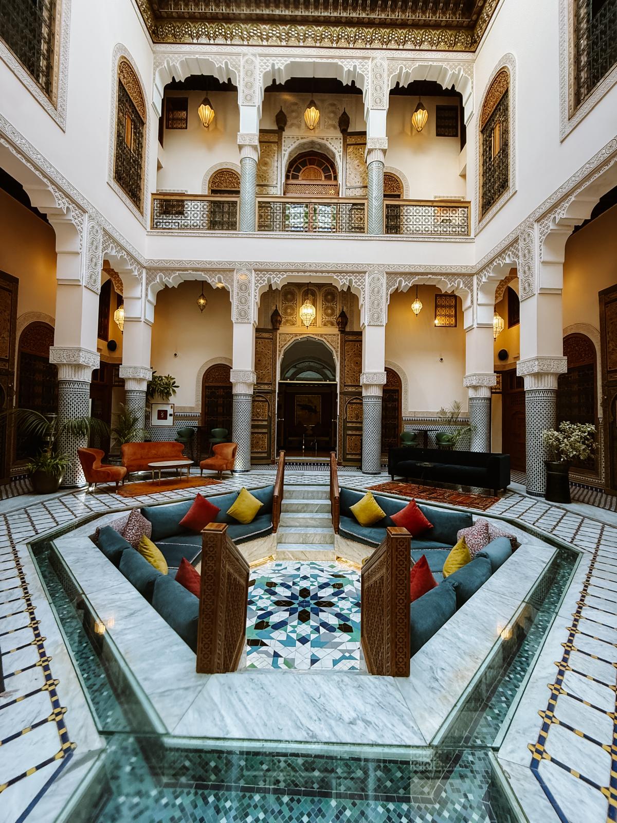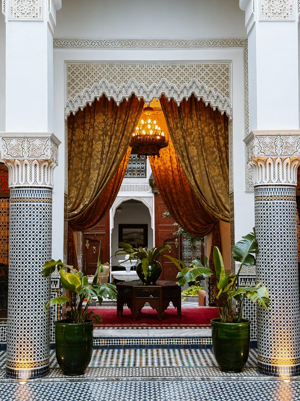 Die Rooftopbar, die eigentlich ein Restaurant ist, gehört zu einem ziemlich luxuriösen Riad El Amine Fes. Und ganz ehrlich: Schon der Weg nach oben ist ein Erlebnis.